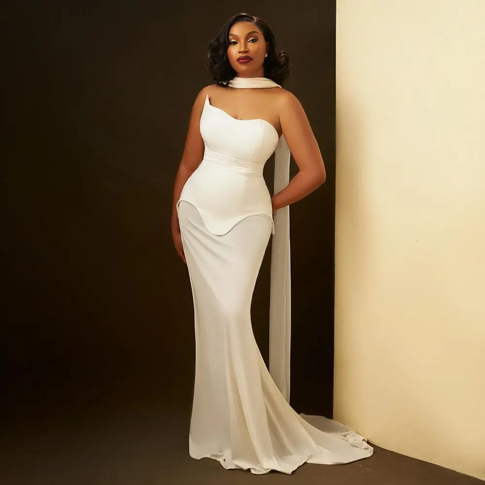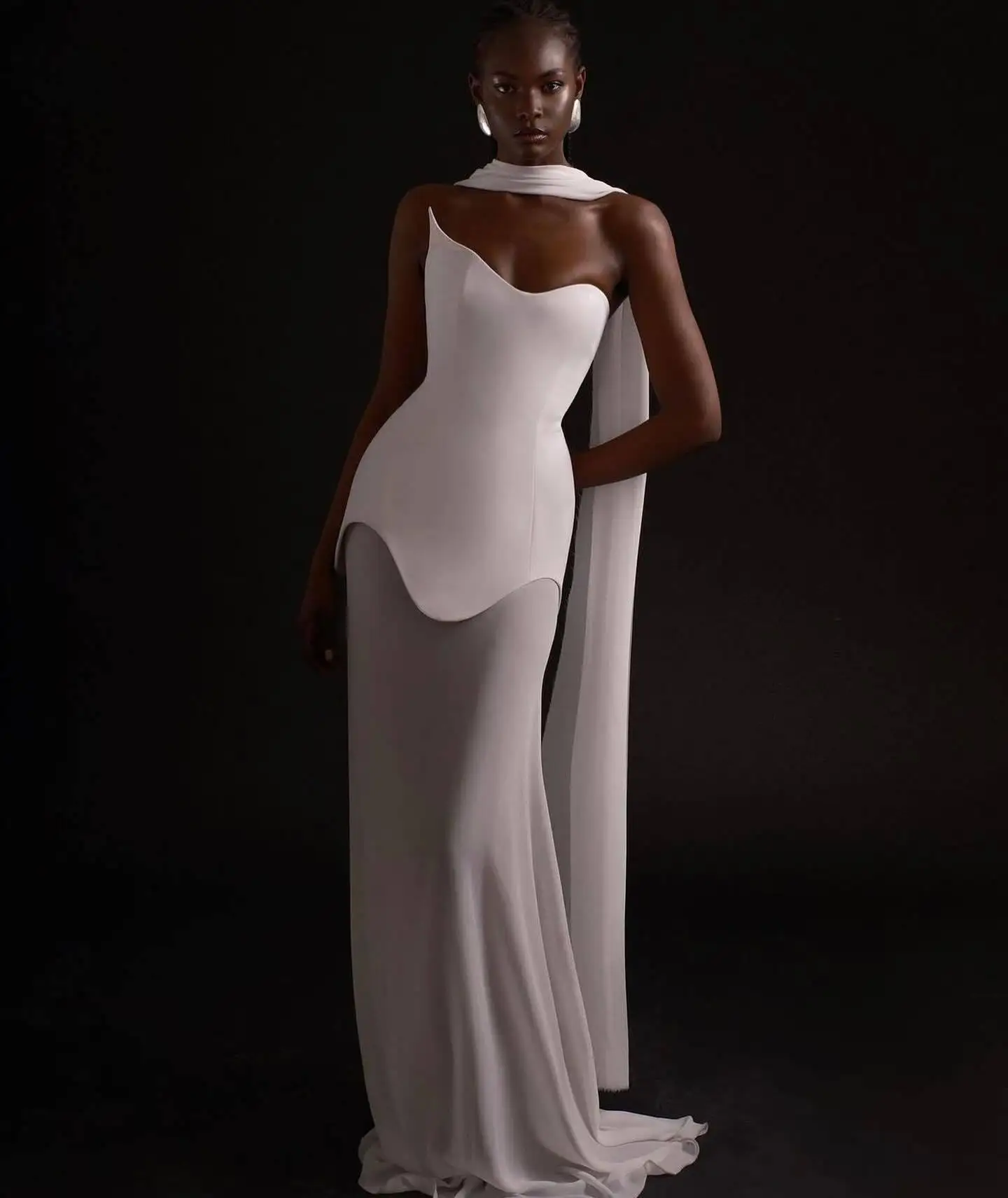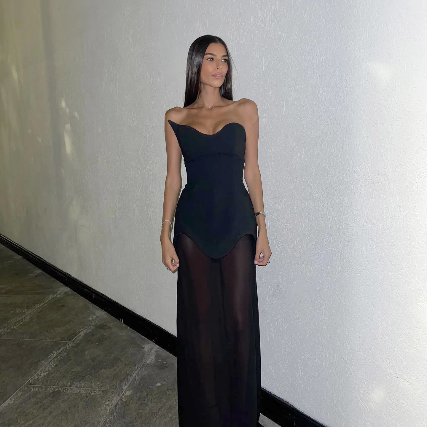 Sexy Strapless Mesh Patchwork Bandage Long Dress With Scarf Women Black White Backless Asymmetrical Celebrity Party Maxi Dresses